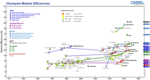 علاوه بر نمایش بازدهی فناوریهای مختلف، رنگبندیهای این نمودار جدید امکان تشخیص ابعاد ماژولها و مینیماژولها از ماژولهای بزرگ تجاری را فراهم میکند. لازم به ذکر است که ابعاد حدودی ماژولها و مینیماژولها بین 200 تا 800 سانتیمترمربع بوده در حالی که ابعاد ماژولهای بزرگ تجاری به بیش از 14000 سانتیمترمربع هم میرسد.